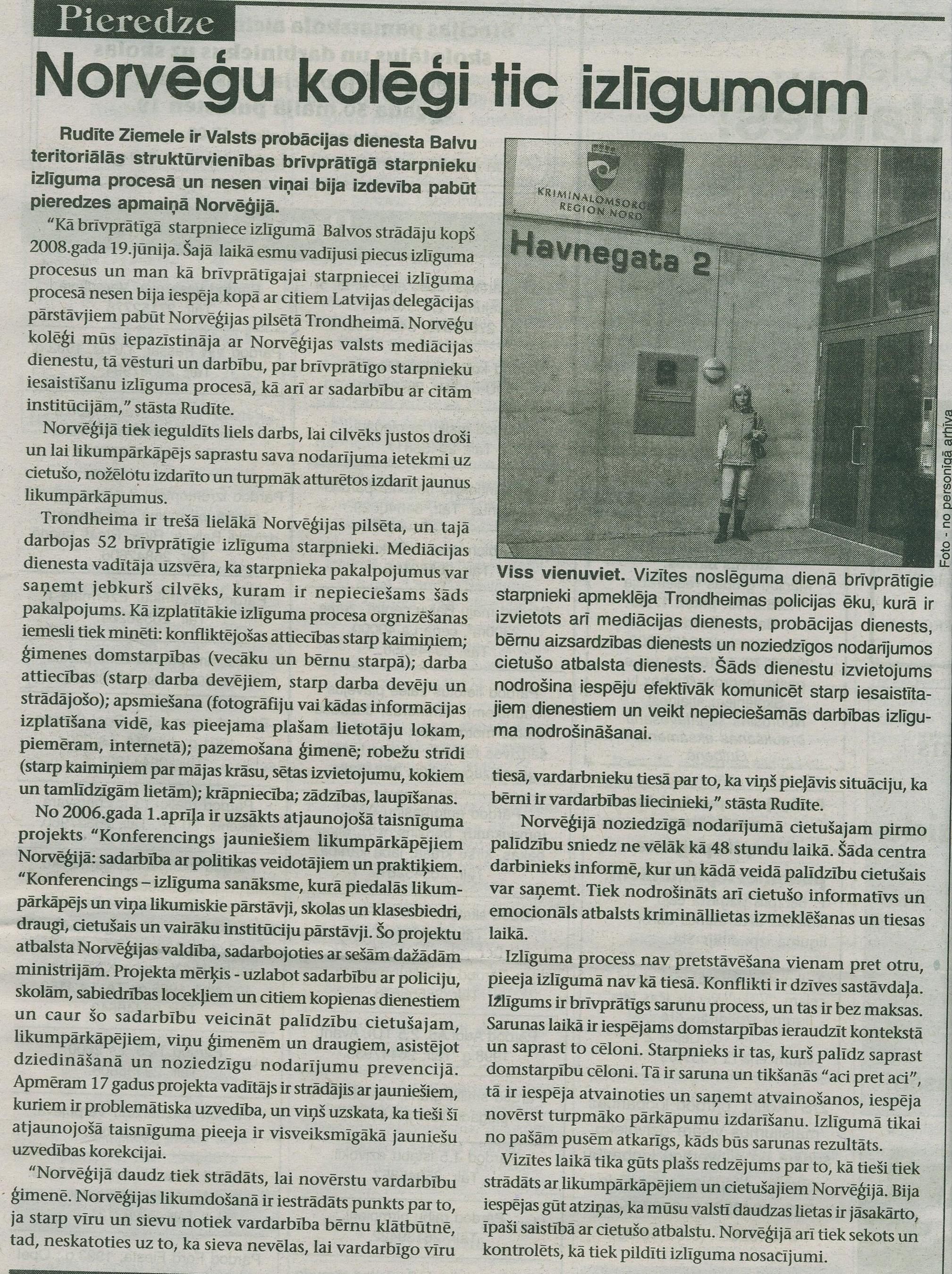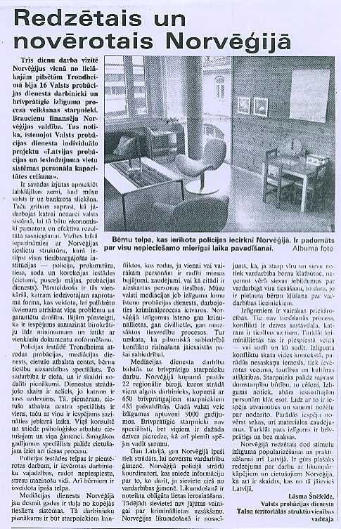 2008. gada 9. jūlijā darbību uzsāka Valsts probācijas dienesta izstrādātais projekts „Latvijas probācijas un ieslodzījuma vietu sistēmas personāla kapacitātes celšana", kas tapis sadarbībā ar Ieslodzījuma vietu pārvaldi un Norvēģijas Izlīguma Departamenta atbalstu. Projekta realizēšanai saņemts atbalsts no Norvēģijas valdības divpusējā finanšu instrumenta.
